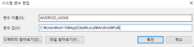 아래와 같이 ANDROID_HOME 시스템 변수를 등록함으로써 해결했다.
