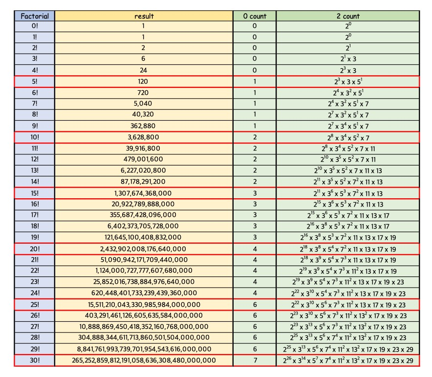 직접 팩토리얼을 구해내는 것보다 훨씬 좋은 방법이 있었다 . .우선 실제 팩토리얼 값을 보면 다음과 같다.