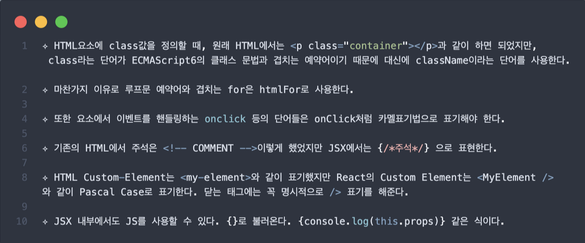 HTML 을 JavaScript 내부에서 사용하는 것이므로 지켜야 할 규칙들이 있다.