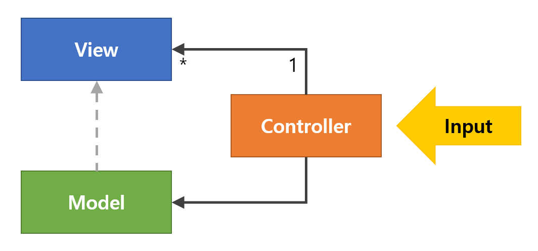 (하나의 Controller 는 View 를 선택할 수 있기에 1:N 관계로, 여러 개의 View 를 관리할 수 있다.)