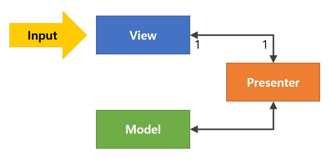 - Presenter : View 로부터 요청받은 이벤트를 처리하고, 처리한 결과를 View 에게 전달 (인터페이스)