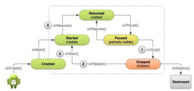⇒ 사용자가 앱을 탐색하고, 앱에서 나가고, 앱으로 다시 돌아가면, 앱의 Activity 인스턴스는 수명 주기 안에서 서로 다른 상태를 통해 전환된다. Activity 클래스는 활동이 상태 변화를 알아차릴 수 있는 여러 콜백을 제공한다. 그렇기에 안드로이드 생명주기를 액티비티 생명주기라 지칭하며, 이는 액티비티가 생성되고 정지되고 재생되고 종료되는 등의 상태 변화와 그에 따른 콜백 메서드를 총칭한다.