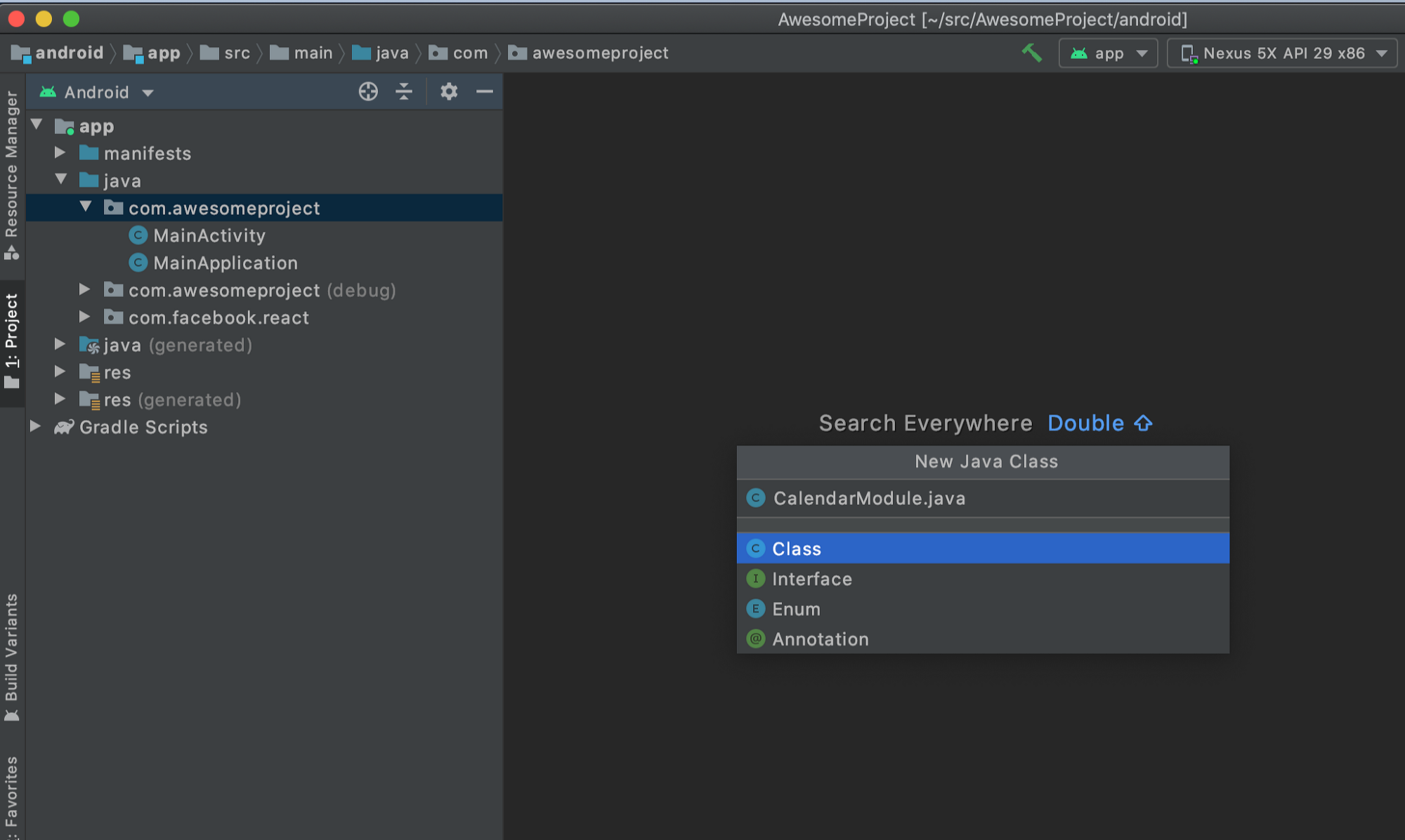 네이티브 모듈을 생성하기 위해 우선 모듈 파일과 패키지 파일을 생성해주어야 한다.